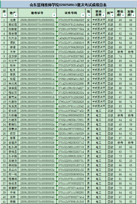山东蓝翔技师学院S20250913批次考生名单及成绩