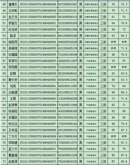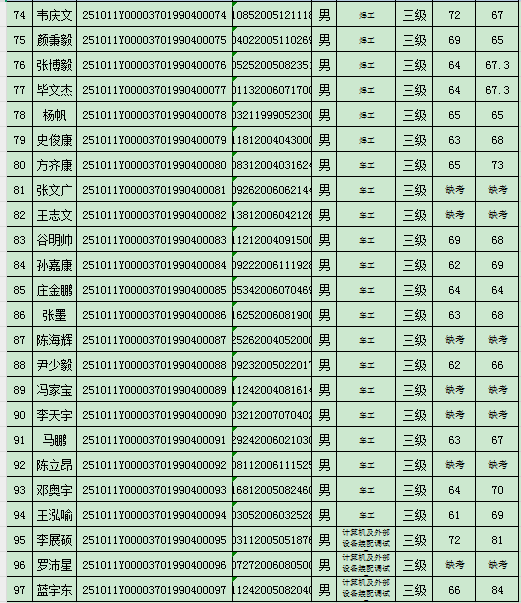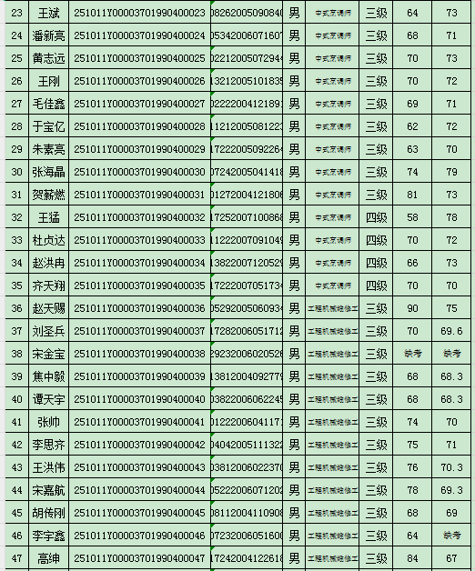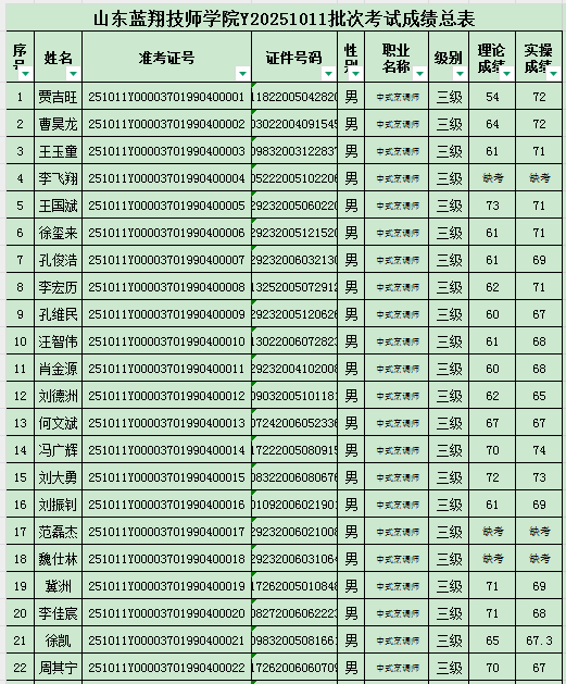 山东蓝翔技师学院Y20251011批次考生名单及成绩