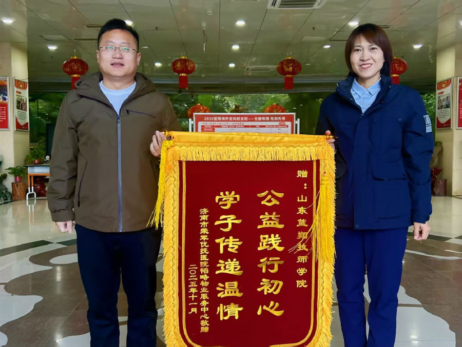 11月27日上午,济南市荣军优抚医院韬略物业服务中心代表,专程来到山东蓝翔技师学院,将一面印有“公益践行初心 学子传递温情”的锦旗郑重赠予学院,以此感谢学院近期的公益剪发活动。